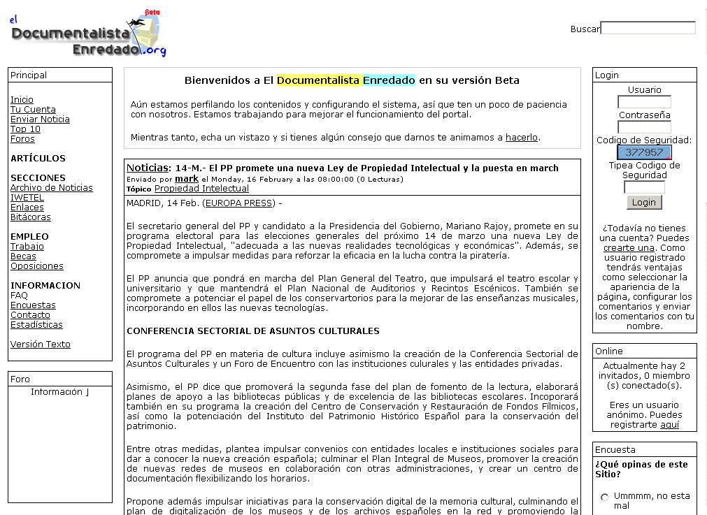 Nos encontrábamos en línea desde el 16 de febrero en la Red y al día siguiente Google ya nos recogía en su índice de páginas. Una grata sorpresa para nosotros, puesto que creíamos que tardaríamos al menos un mes en ser recuperables por el famoso buscador y algunos más sobre el resto. Esto dio lugar a nuestro primer usuario registrado, ajeno a nuestro grupo de conocidos, apenas 2 días después de nuestro nacimiento. En cualquier caso, este primer pantallazo nos permite observar la sencillez de la primera interfaz.